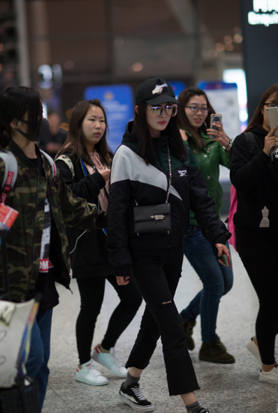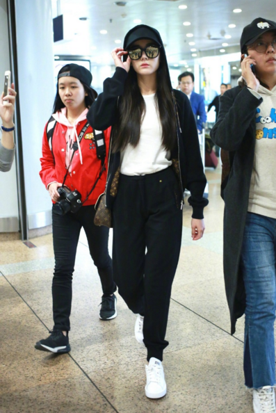 范冰冰的这一套蓝色运动卫衣套装很有校服的味道,不过卡通人物印花更显轻松时髦,还很减龄。