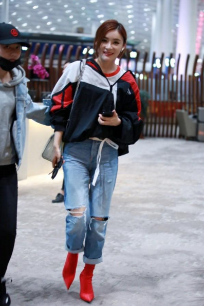 袁姗姗身穿Vetements x Reebok 复古拼色运动联名上衣,休闲很有80年代校服的色彩,下穿Topshop破洞露膝宽松卷边牛仔裤,轻松悠闲。不过脚下的大红色尖头细跟袜子靴,强硬更时髦。曾经的我们不是都努力的将校服穿出不一样么?