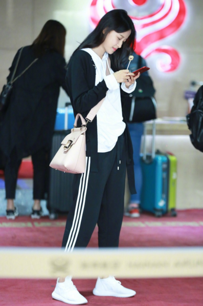 孙怡的黑白配也很不错哦,休闲卫衣搭配侧边条运动裤,轻松休闲,终于找到个爱穿校服运动裤的时尚达人了。改版的校服运动裤就是好看。