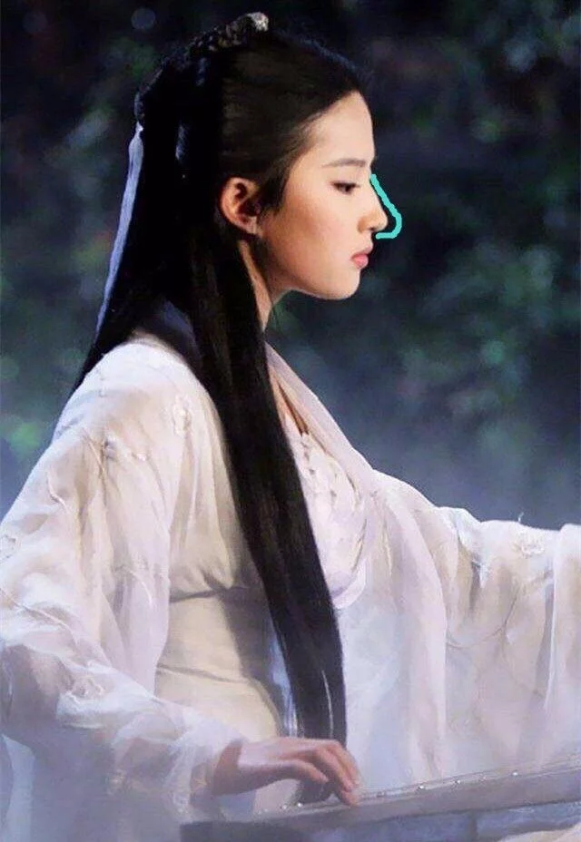 刘亦菲的鼻型大致属于水滴鼻,侧面鼻梁高挺,鼻头圆滑,立体又不失温柔