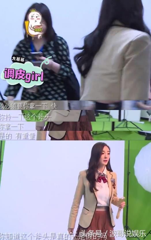 拍摄结束后,杨幂拿着斧头问在场工作人员是真的还是假的?工作人员表示是真的,这个有重量。大幂幂知道是真的斧头后就开始调皮了,让一旁的婷婷来拿一下,拎一下这个斧头。婷婷刚开始拒绝,但是大幂幂很强势的表示必须要你拿一下。哈哈哈,婷婷无奈结果斧头,大笑诶呀,好重呀!