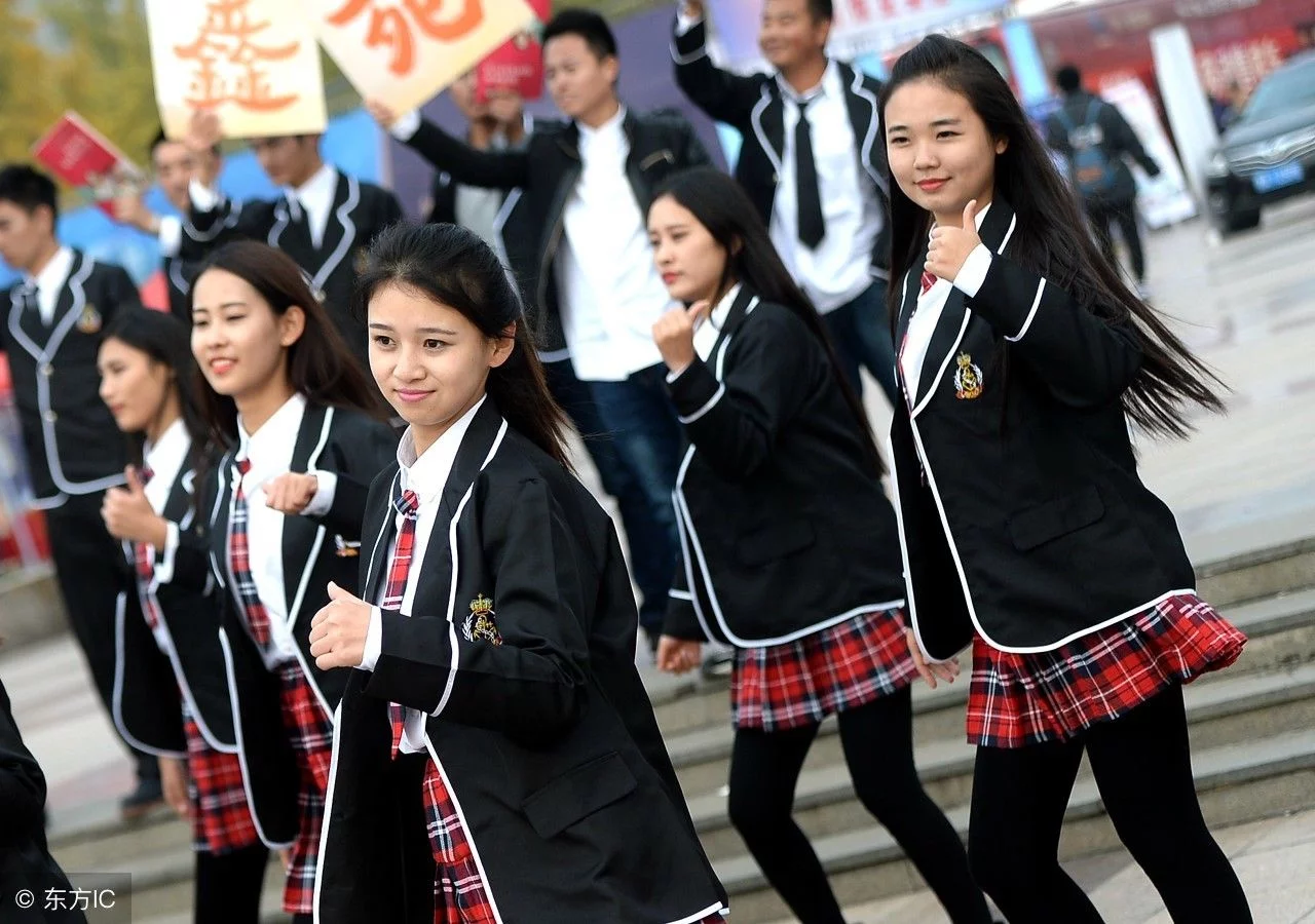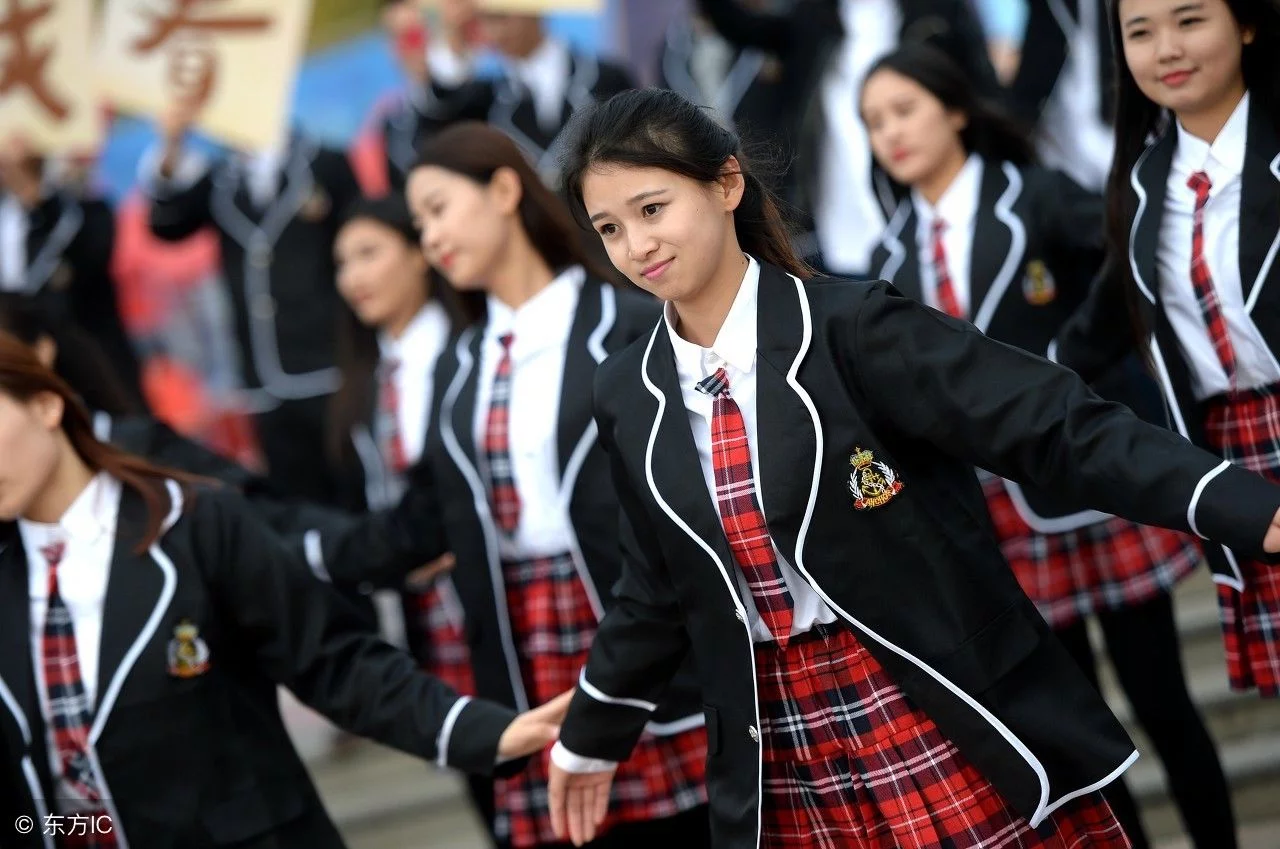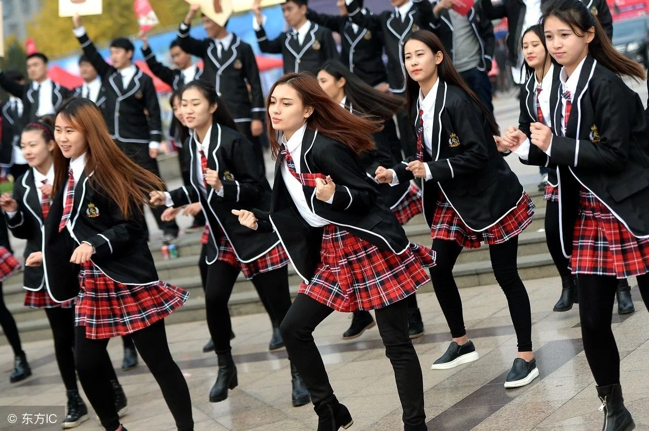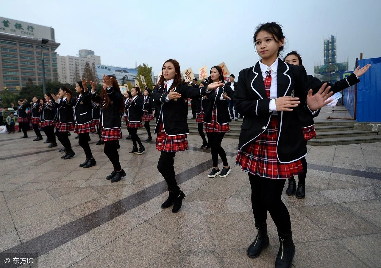 山东省济南市,50名在校女大学生身穿校服短裙来到泉城广场,在音乐的伴奏声中跳起热舞,并不时做出卖萌可爱的表情,吸引了众多市民围观。(图片来自东方IC)