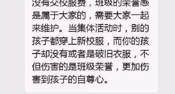 可等到第二天晚上的时候,老师却在家长群上发来了这样的一条信息,上面公布着没有买校服学生的名字,其中,涛涛的名字就在上面。并且表示不买校服的学生没有班级的荣誉感,而且还说了一些很难听的话,接下来还有一些家长在下面留言,说了一些力挺老师的话。这让李女士很是生气,她觉得老师不应该在群上这么说,自家的孩子又不是没有校服穿。看见李女士这么的生气,她的丈夫则表示,就给他200块钱买一套呗,省的搞出一些不必要的麻烦。但李女士现在觉得不是钱的问题,而是老师作风有问题。