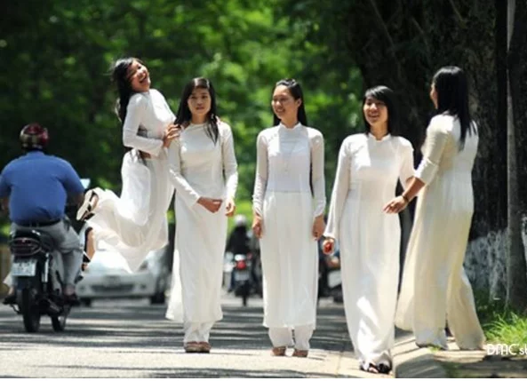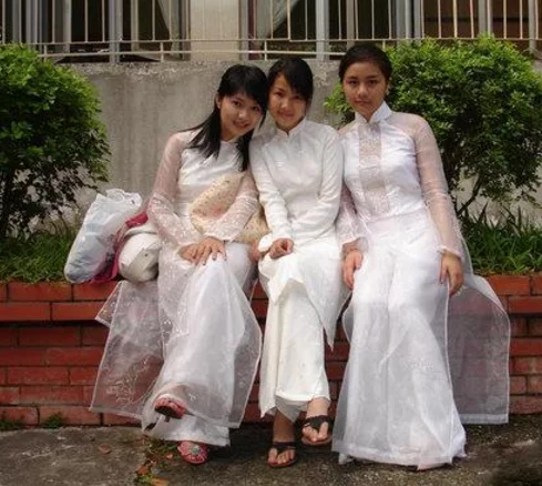 此服饰被称为奥黛服饰,是为越南国服,类似于中国的旗袍。图为身着校服的女生。