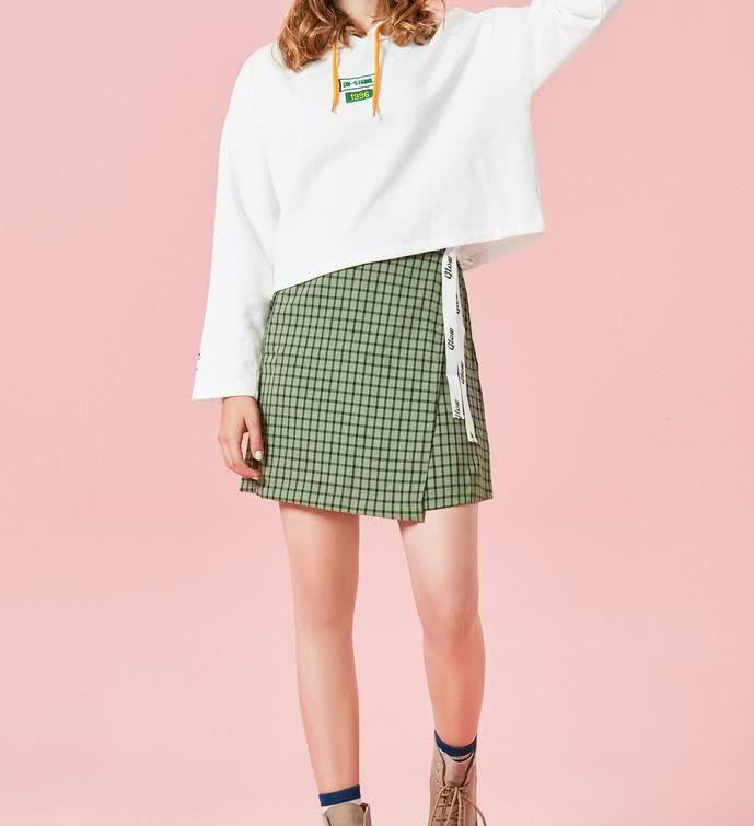 白色的内搭,穿起来短款的设计,将自己的身材比例都完全展现,尽显洋气洒脱的时尚效果,这样的绿色格纹半身裙,更是显得腿很是修长笔直了,比例和线条感不错。