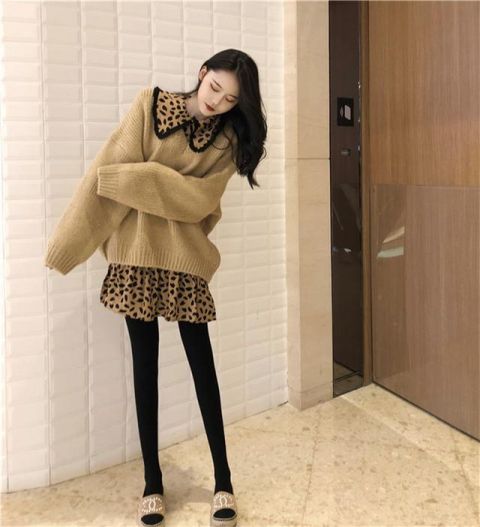 复古流苏豹纹娃娃裙连衣裙毛衣套头针织衫,宽松的款式,豹纹娃娃领的设计,显嫩又俏皮。