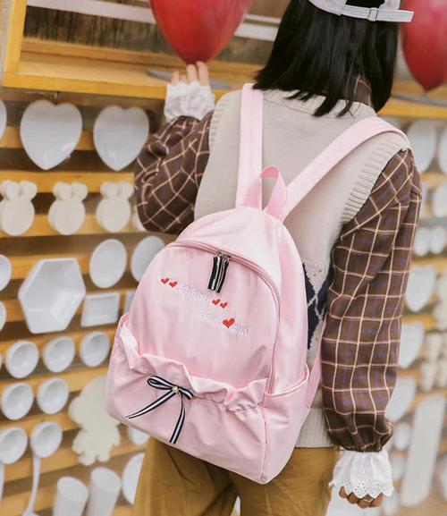 最后还有一款相当“少女感”的双肩包,精致小巧的花边和蝴蝶结,还有简约的字母和小爱心印花,软萌可爱,甜美淑女,开学背着一定比隔壁班花还招人喜欢!