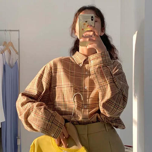 这件颜色就比较活泼一点了,比较适合温柔一点的女生穿,宽松的衬衫,里面就算套一件短袖也没问题了。夏天还可以把扣子解开敞怀穿。是不是十分的方便呢。