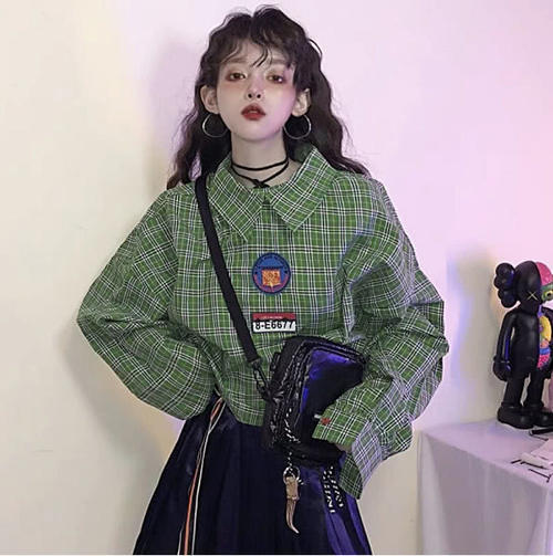 这件绿色的衬衫设计感十足,胸前并不是系扣子的,这件衬衫是套头穿的,这种草绿色也十分的复古,长长的袖子让整个人看起来十分的娇小!胸前的刺绣贴也是整件衣服的亮眼之处!