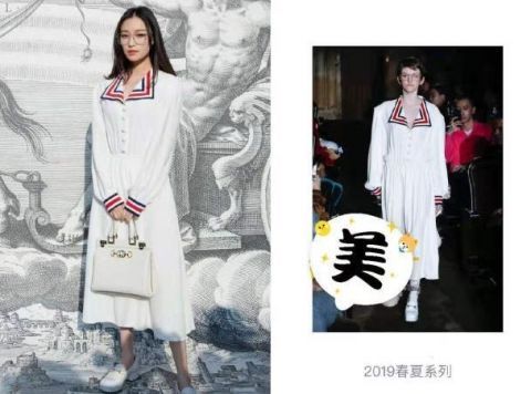 这条看似很简单很学生的裙子实际上今年春夏新款,右图就是模特上身的效果,是不是看着更大气更有范儿一些?其实这条裙子是可以穿出很强气场的,但是倪妮没有hold住它,穿成了一条学院风的校服裙。
