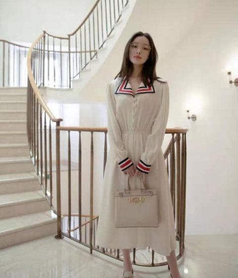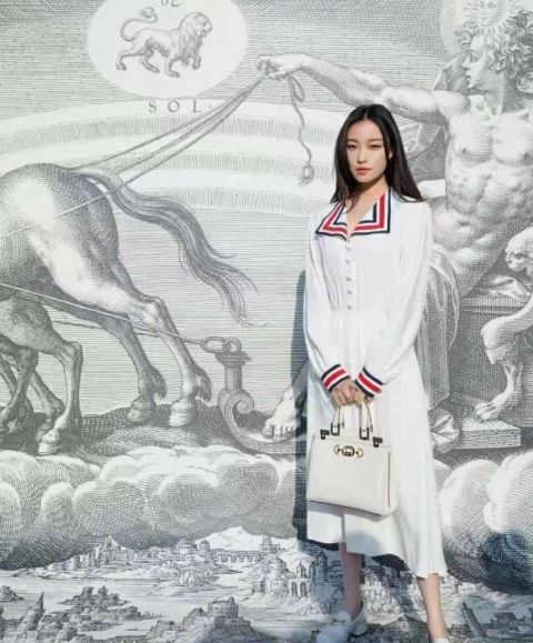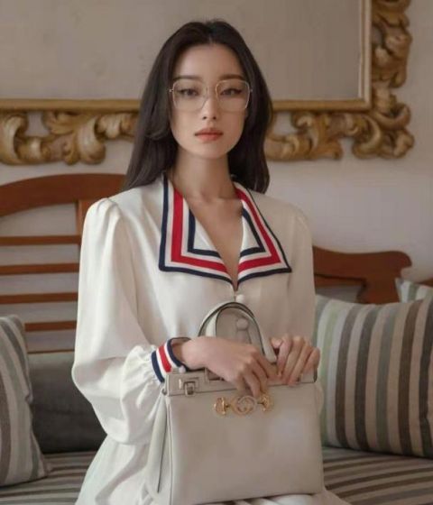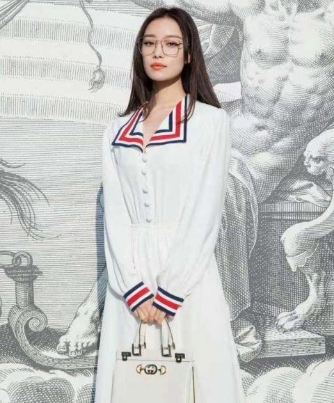 这张照片就没有那么浓的学生气了,毕竟金色镜片后的眼妆太浓了,而且她手中还拿着一个白色的手提包,版型比较大气,设计简约,很配这条裙子,看着很淑女。就是这样正襟危坐看着有些呆板,不是很大方。