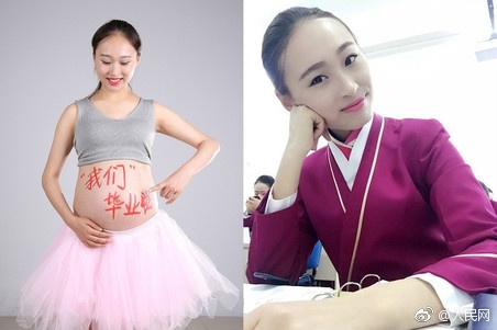 近日,四川一高校的空中乘务专业毕业生潘红莉拍摄的一组“孕”味十足的大肚毕业照吸引了众多人的关注。刚上大三就被航空公司录取成为空姐,随后结婚、怀孕,22岁的潘红莉成为同学眼中不折不扣的“人生赢家”。图为潘红莉怀孕前后对比照。