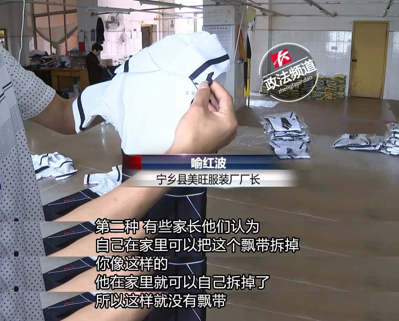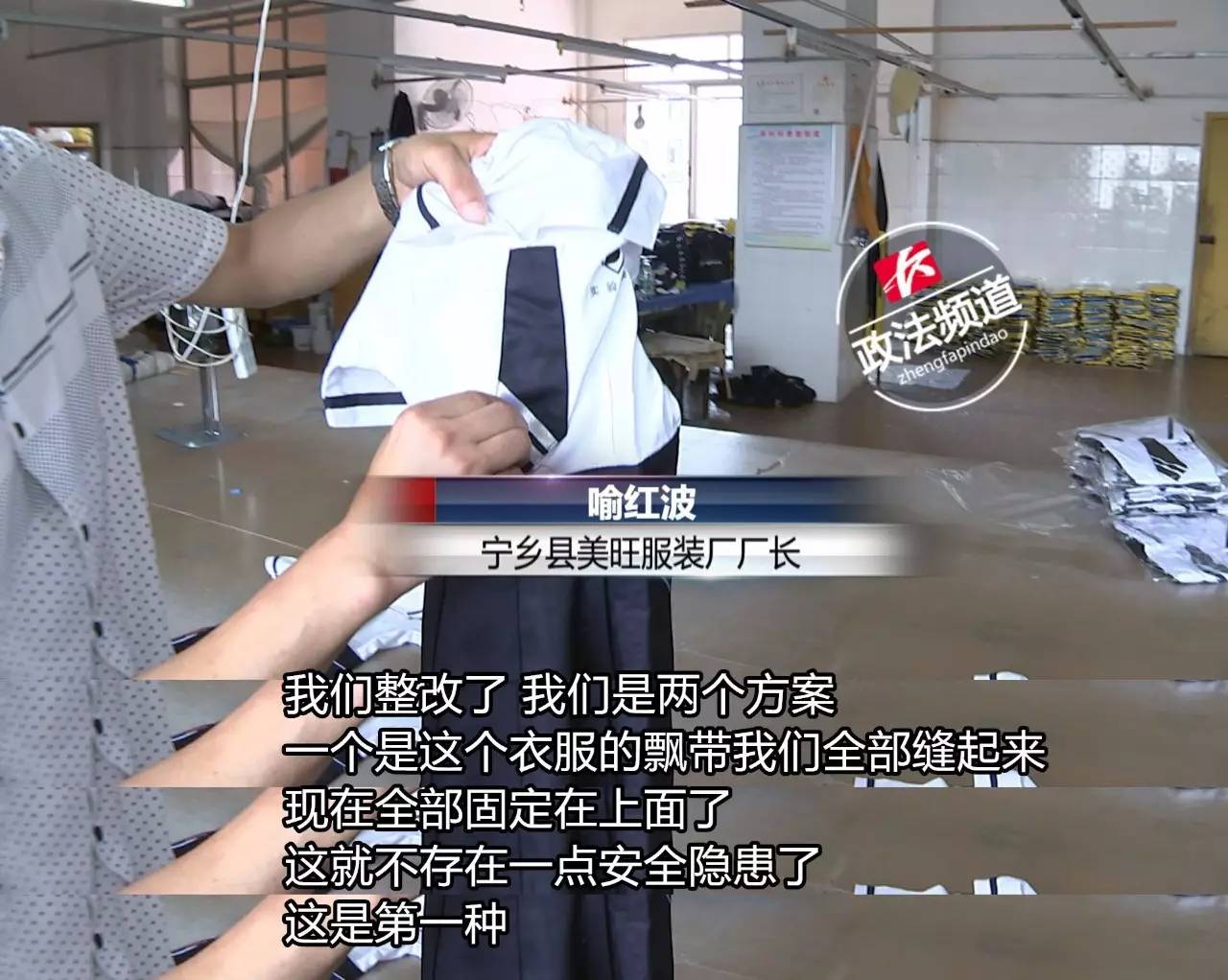 ▲按照服装国标,婴幼儿及七岁以下儿童服装,头部和颈部调整服装尺寸的绳带不应有自由端,其他绳带不应有长度75毫米的自由端。 长沙市质监局法规处处长张文革称,宁乡美旺服装厂生产的夏季学生服,校服颈部有长约140毫米的领带状绳带,而这根绳带有可能被外部物体夹住,导致儿童运动中跌倒或缠住,存在可能直接或间接导致儿童身体伤害的安全隐患,不符合国家标准要求。 2016年下半年,长沙市质监局在日常检查中,发现浏阳市同升服装厂和宁乡县美旺服装厂生产的部分校服存在绳带过长的情况。 长沙市质监局要求厂家召回整改 长沙市质监局2017年2月25日启动缺陷产品召回工作,截至5月4日,召回缺陷学生校服3900套,其中,浏阳市同升服装厂2000套,宁乡县美旺服装厂1900套。 为了核实企业的落实情况,11日上午,长沙市质监局工作人员再次来到了宁乡县美旺服装厂进行情况抽查。