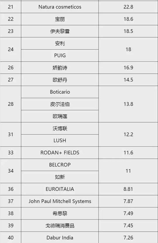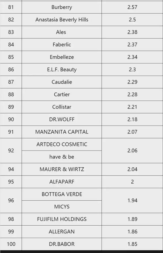 值得注意的是,此次上榜的100家美妆企业中有4家来自中国,分别是排名第47的上海家化联合股份有限公司、排名第57位的伽蓝(集团)股份有限公司、排名第72位的香港利丰集团以及排名第75位的江苏隆力奇生物科技股份有限公司。