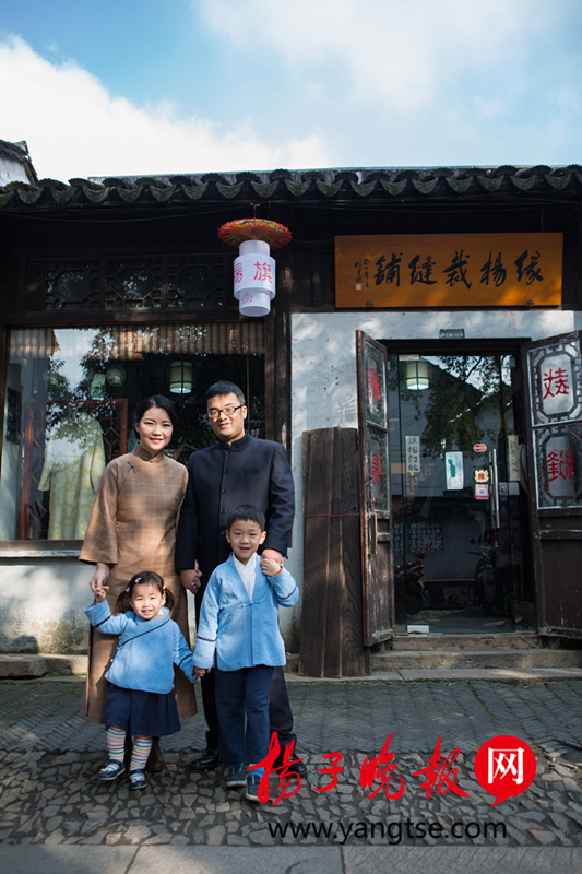 杨蓓和儿女在一起。 扬子晚报7月4日讯(记者 张毕荣)位于苏州平江路上的缘杨裁缝铺内,80后姑娘杨蓓正在精心设计一款新版“国民校服”,这位来自四川自贡的女子,对于中国传统服饰文化非常痴情,曾经作为一名高校教师的她,为了全身心设计制作“国民校服”,干脆辞职一心一意进行构思和创作,由她设计的“国民校服”系列一经推出,便受到了许多学生、家长以及老师的点赞,孩子穿上后显得精气神十足,家长对此也赞不绝口。最近,杨蓓亲自设计的“国民校服”夏装正式亮相,一套关于“国民校服”的设计制作标准也正在制定中,旨在让更多的孩子有机会穿上“国民校服”。 灵感源于儿女平时穿的小中装和小旗袍 杨蓓从四川一所师范学校毕业后,来到苏州工业园区一所高校从事教师职业,一次偶然的机会,她来到了苏州平江路历史文化街区,古色古香的建筑风格,原汁原味的水乡生活,让这个生长在四川的姑娘一下子就爱上了这里,她觉得这里的生活环境是自己一直梦寐以求的。于是,杨蓓便决定在苏州成家立业。2009年,杨蓓携手知心人走入婚姻的的殿堂。婚后,她时常身着自己制作的旗袍,和爱人漫步在苏州的大街小巷,一起经营着甜蜜的婚姻。2010年,儿子“杨杨”出生了,初为人母的杨蓓,内心充满了喜悦。2013年,女儿“园园”顺利降生,儿女双全的她在倍感幸福甜蜜的同时,生活也变得更加忙碌。杨蓓告诉记者,“国民校服”的灵感来源于自己的儿子和女儿平时穿的小中装和小旗袍,随着儿子“杨杨”进入幼儿园,开始有了统一的校服,杨蓓突然回忆起自己上学时穿的校服,似乎回忆没那么美好。于是,她把儿子作为“国民校服”的第一位客户和代言人,给儿子开发了正装和运动装两个系列的校服。可爱的一双儿女每天穿上妈妈亲手设计的“国民校服”上学,经常会引来别的学生羡慕的目光。当儿子所在的幼儿园进行活动演出时,许多孩子家长便决定统一采用杨蓓设计的“国民校服”作为演出服饰。另外,“国民校服”也开始在苏州的一些外国语学校流行起来。 辞去高校教师职位专心设计“国民校服” 因为对中国传统服饰文化的热爱及对“国民校服”的痴心,杨蓓放弃了大学老师的职位,决定在古朴清幽的平江路开设一家裁缝铺。记者看到,不同于旧时的裁缝铺里挂满了布料,杨蓓的裁缝铺摆放着的是各种款式的旗袍。而这些旗袍基本不用于零售,仅用于展示,顾客可以试穿,试穿满意后由老师傅再给顾客量身定制。据介绍,做一身旗袍要测量26个尺寸,因为纯手工制作,一般定制之后一个月才能拿到衣服。顾客有特殊定制需求,杨蓓也会根据需求给客户重新设计,打样再制作。杨蓓设计的众多旗袍系列里,有一个古法系列旗袍,从款式、面料到剪裁、缝制方法,全方位复原民国旗袍的样子。在妈妈的熏陶和培养之下,女儿“园园”已经变成了平江路上的“旗袍小美女”,为这条古朴的老街增添了新生的气息。为了设计制作出更适合学生穿的“国民校服”,杨蓓不仅在面料上花了很多心思,跑了许多地方寻找适合的面料,而且在裁剪、缝制方面特别用心。记者了解到,杨蓓在“国民校服”系列上可谓下足了功夫,历经三年多时间的构思和设计,光是“国民校服”的设计图稿就有数十套。