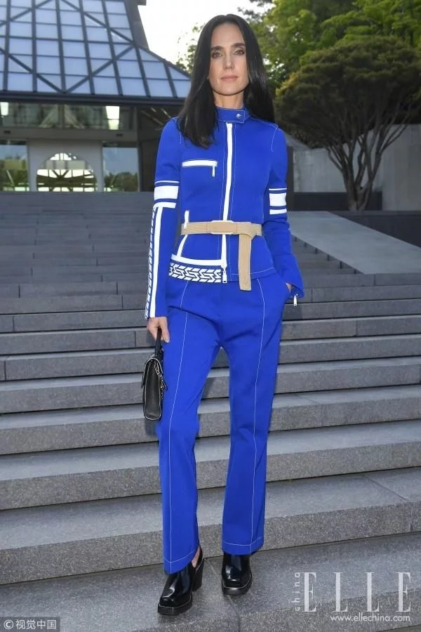 蓝白机车夹克运动套装,几条白杠增加设计感,脚踩黑色漆皮高跟短靴,酷帅十足。