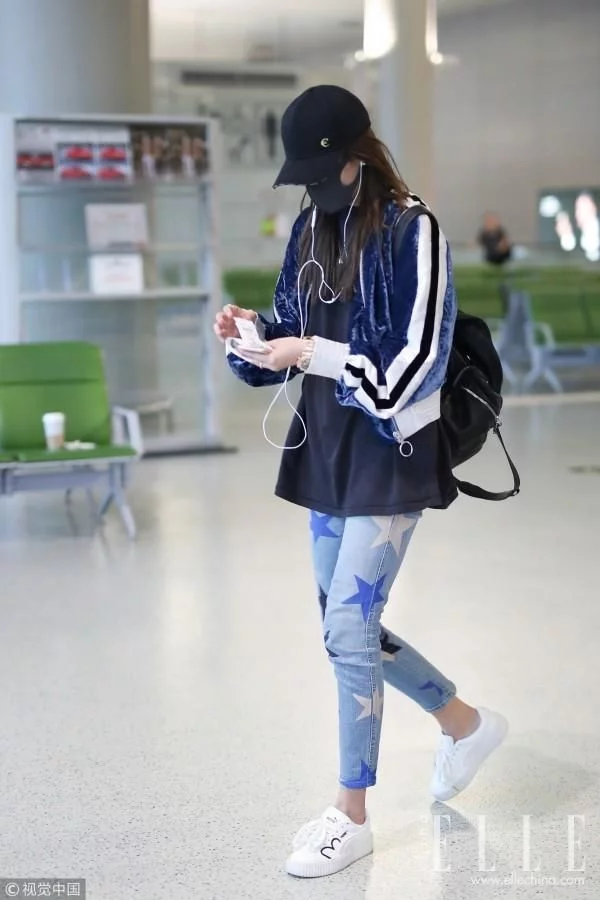 关晓彤身穿黑白拼色带边深蓝色丝绒运动外套,下身穿Stella McCartney五角星牛仔裤,脚踩Puma厚底小白鞋,休闲有活力。