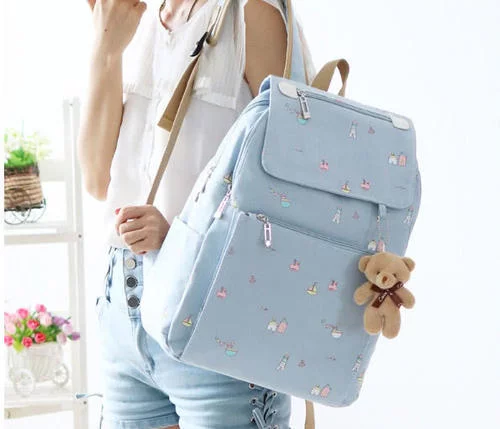 单单糖果蓝色,很小清新的味道嘛,上面还有一只可爱的毛绒小熊公仔,对于那种学院风的萌妹子来说在合适不过来,本来人就是可爱风格的,双肩包当然也要找一个可爱风格的来搭配自己啦,这样才能衬托出自己的style出来!