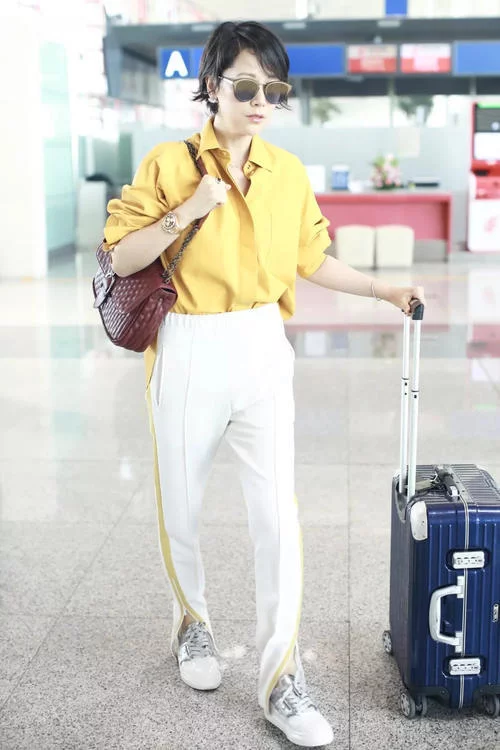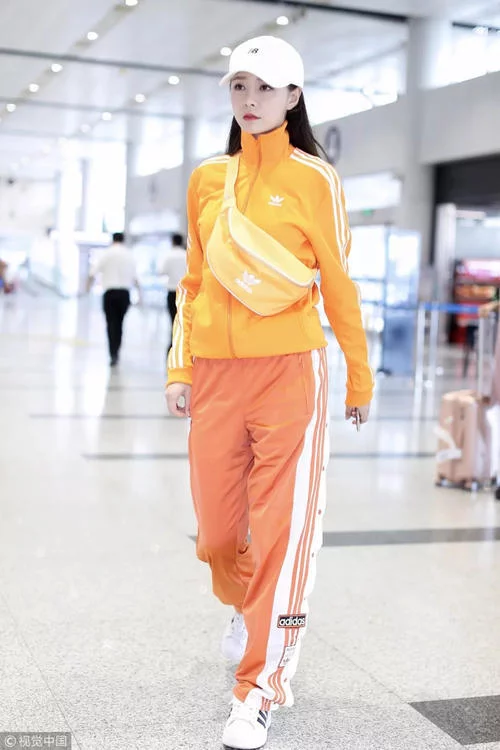 沈梦辰这身行头来自Adidas,明黄运动服+橘色运动裤+白色板鞋,明亮的运动造型非常吸睛,两侧条纹上的纽扣装饰也增加了造型的观赏度。