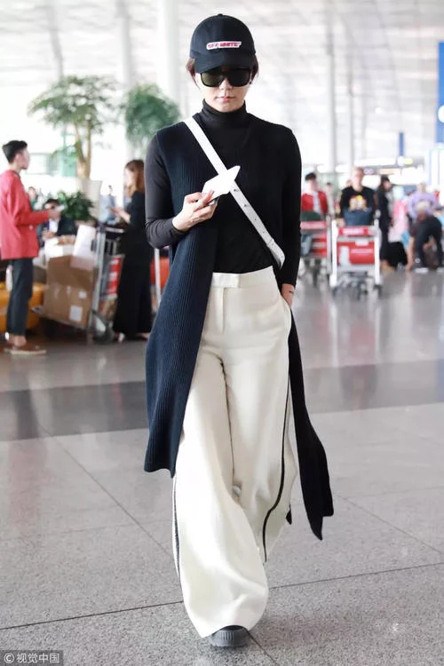关键词:休闲裤改良 顾名思义,将条纹运动裤与休闲裤完美融合将两者合二为一,带来更洒脱的穿搭体验! 王珞丹黑色紧身衣外搭针织马甲,下搭白色阔腿裤,宽阔的裤腿让造型充满动感,黑白配则让王珞丹看起来非常高冷,霸气十足!