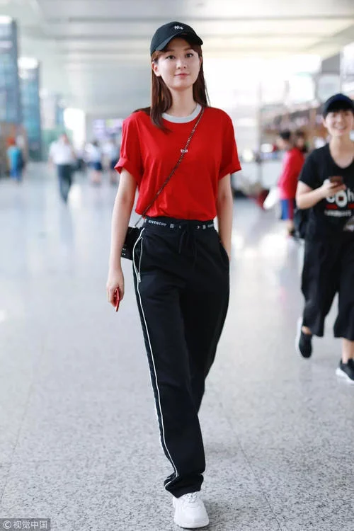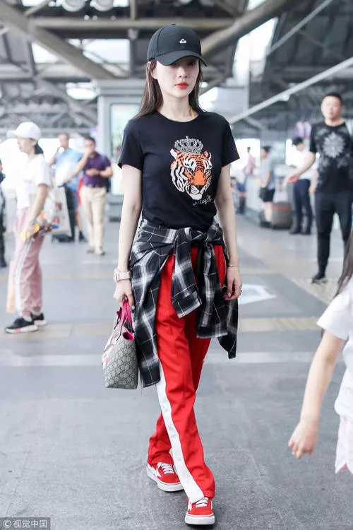 同样选择条纹T恤的宋茜则半掖半放的搭配了红色运动裤,将裤脚卷起来加深了裤腿的立体感,看似简单却搭配的十分用心。