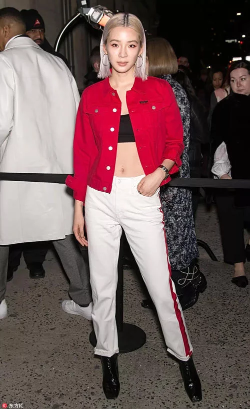 黑色抹胸外搭红色夹克,白色休闲裤的红色条纹与上衣呼应,整个黑白红造型简单却极具气场。