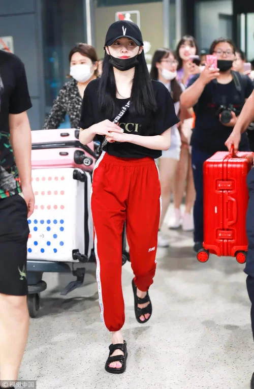 周洁琼头戴黑色棒球帽,身穿GUCCI黑色T恤,鲜艳的红色运动裤让整个造型都变得明亮了起来,与前面的宽螺纹收口不同,这条运动裤收口简洁利落带来九分裤的既视感。