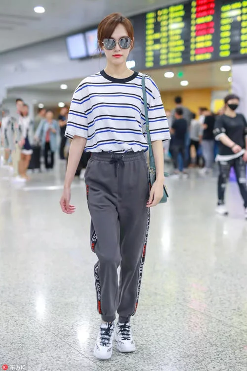 糖糖这身造型就比较接地气儿了,条纹T恤下搭灰色运动裤和白色运动鞋,造型清爽低调。