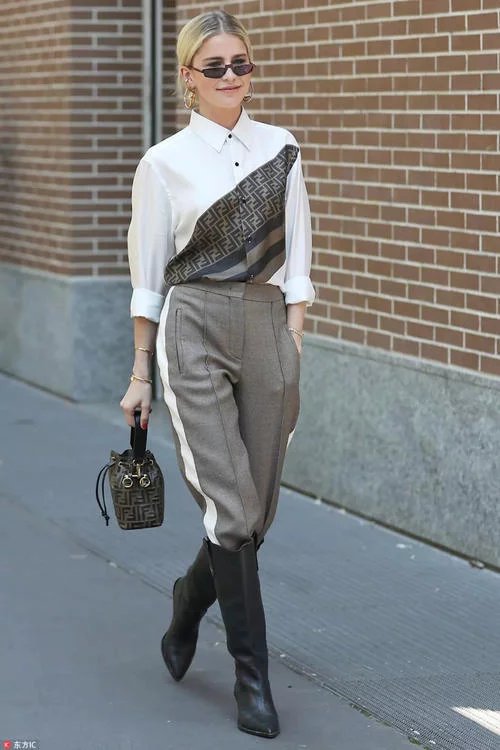 关键词:纽扣装饰 在条纹上加入一点纽扣装饰使条纹部分更加立体,也让运动裤时尚感瞬间爆表,这样的设计真的很赞! 小明卡其色高领卫衣外搭毛呢马甲,下搭卡其色条纹裤和厚底鞋,修身的造型对超模身材的小明自然毫无难度,轻松搭出时髦小姐姐。