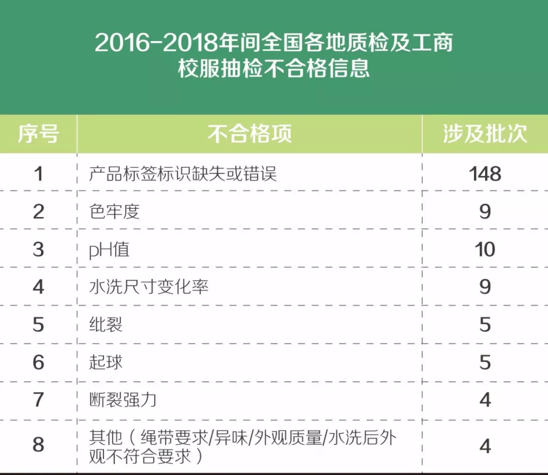 2018年9月,《消费者报道》整理了2016-2018年间,全国各地质检及工商总局的校服质量抽检情况,共计抽检1174批次,其中合格996批次,合格率为84.8%;不合格178批次,不合格率约为15.2%。 这些校服的不合格项主要集中在pH值、色牢度以及水洗尺寸变化率等方面,其中以纤维成分或含量虚标为不合格项之首。 而许多父母所担心的校服甲醛超标问题,在本刊整理的抽检信息中并未发现。